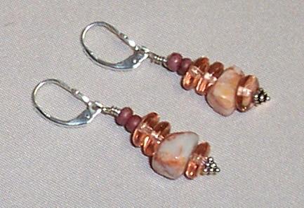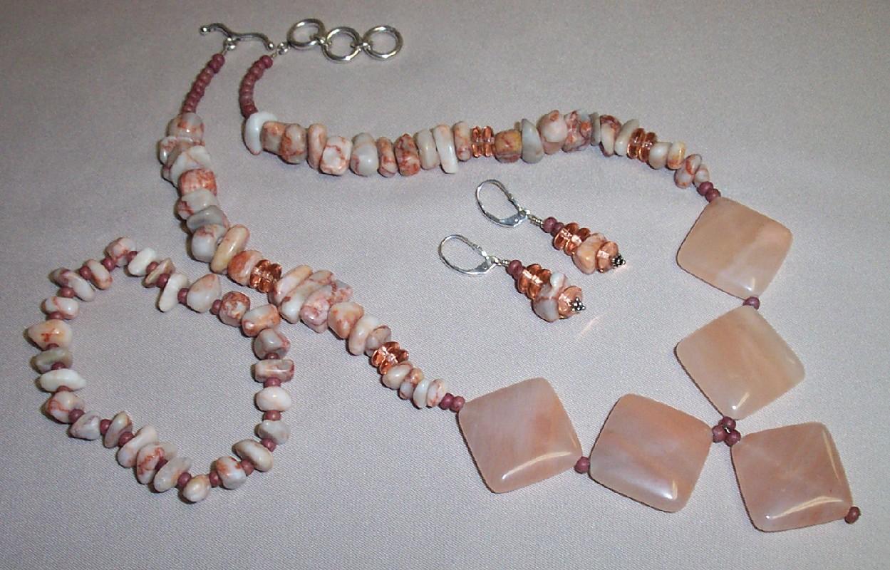 Peach amazonite,20/20 mm sq, irregular 10/6mm, rounds 7mm. Adjustable clasp. Leverback earrings. Sterling
