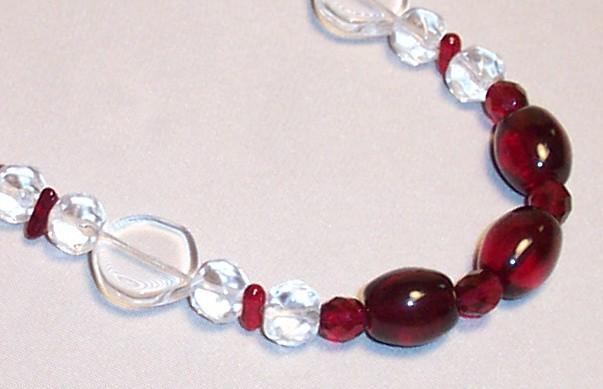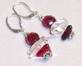 Center ruby red oval glass 8/15mm, red faceted 5mm, clear glass rounds 8mm, clear round flat 20mm, irregular crystal. Leverback earrings. Sterling