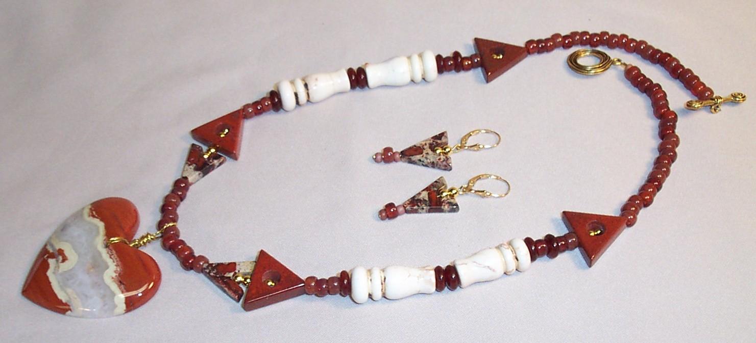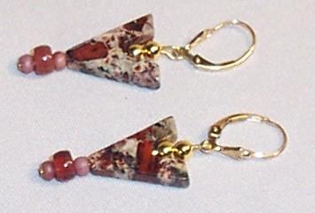 Heart 52/50 mm, v-shaped jasper 18/18 mm, triangle jasper 22mm, sculptured 27/11 mm, coin amber 4mm. Leverback earrings. G.F.