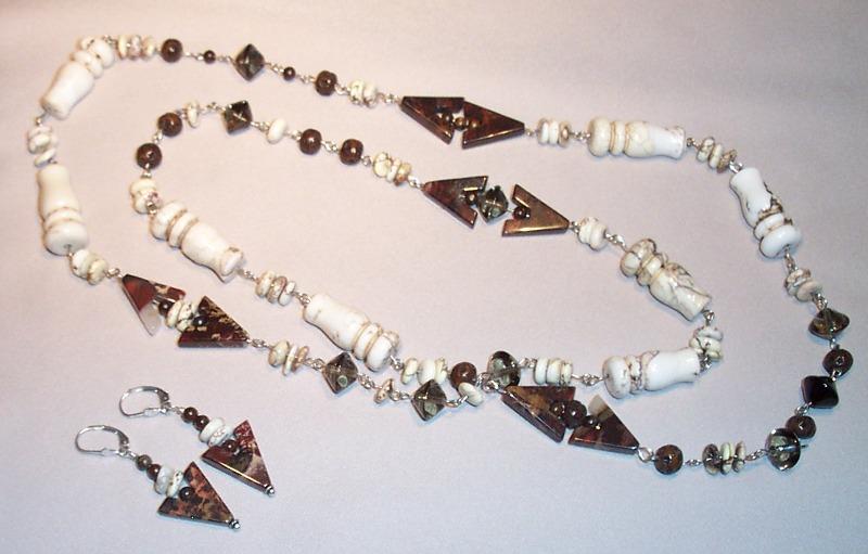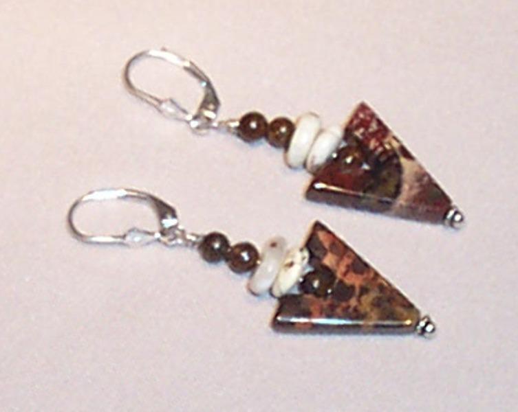 Howlite 11/27mm, V-shaped jasper 15/19mm, glass saucer 10/10mm. Leverback earrings. Sterling