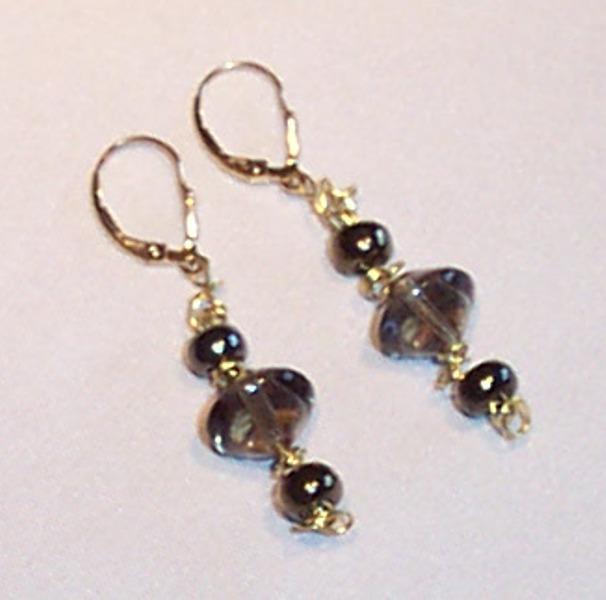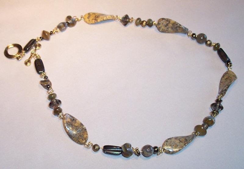 Leopard skin jasper 16/30mm, agate round 10mm, glass saucer 10mm, shell 5/15mm. Leverback earrings G. F.