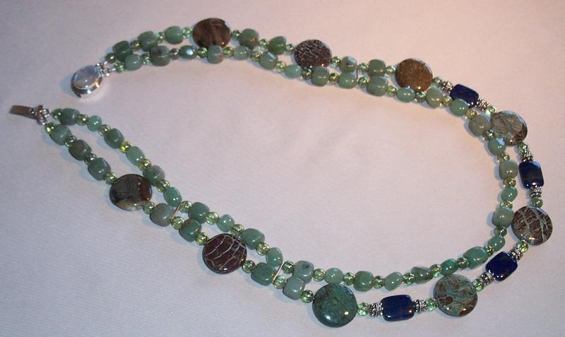 Amulet jasper 20mm, lapis 10/14 mm, jade 8/10 mm, Czech glass rounds 4mm. Leverback earrings. Sterling.