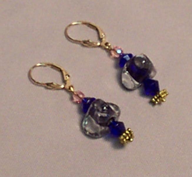 Chalcedony triangle 25/35mm, crystal round 20mm, glass center 10/12mm. Leverback earrings. G.F.