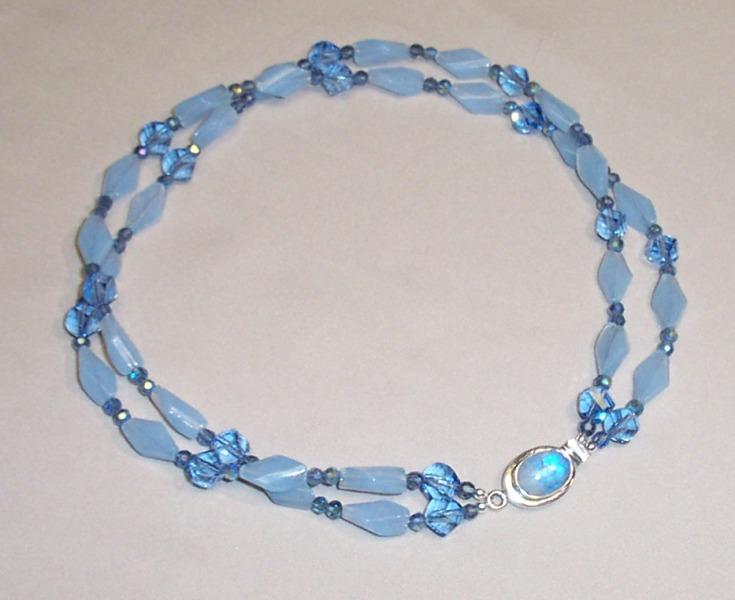 Faceted crystal rounds 8mm, oval glass 9/15mm, crystal rounds 4mm. Clasp moonstone. Leverback earrings. Sterling.