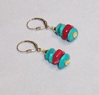 Turquoise, coral. Leverback earrings. G.F.