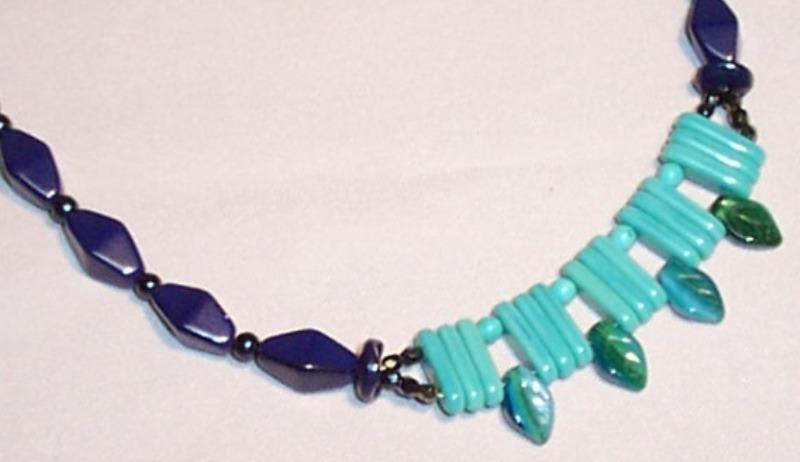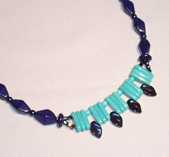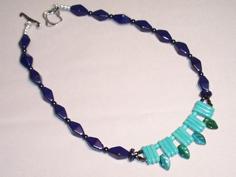 Czech glass. Two sided. Leaves navy one side and turquoise/green the other side. Steling toggle.