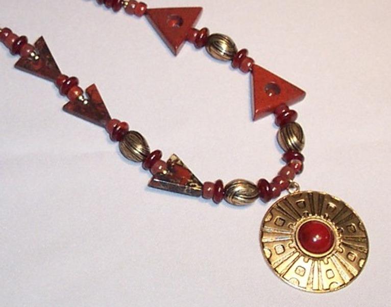 Monet pendant, jasper, amber, glass. G.F. earrings.