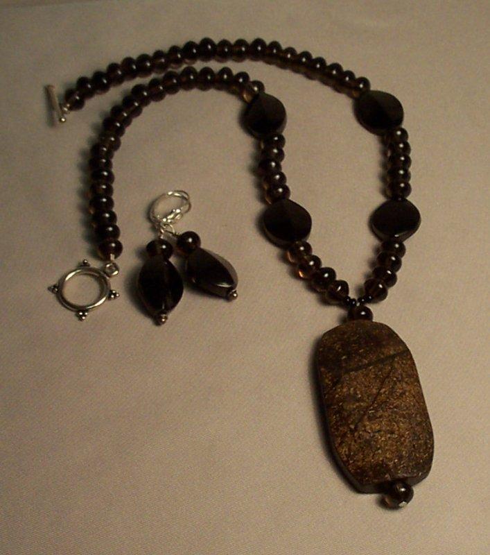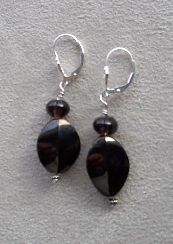 Faceted stone 52/27mm, faceted oval black tourmaline 15/20mm, smokey quartz rondelle 8mm. Leverback earrings. Sterling.