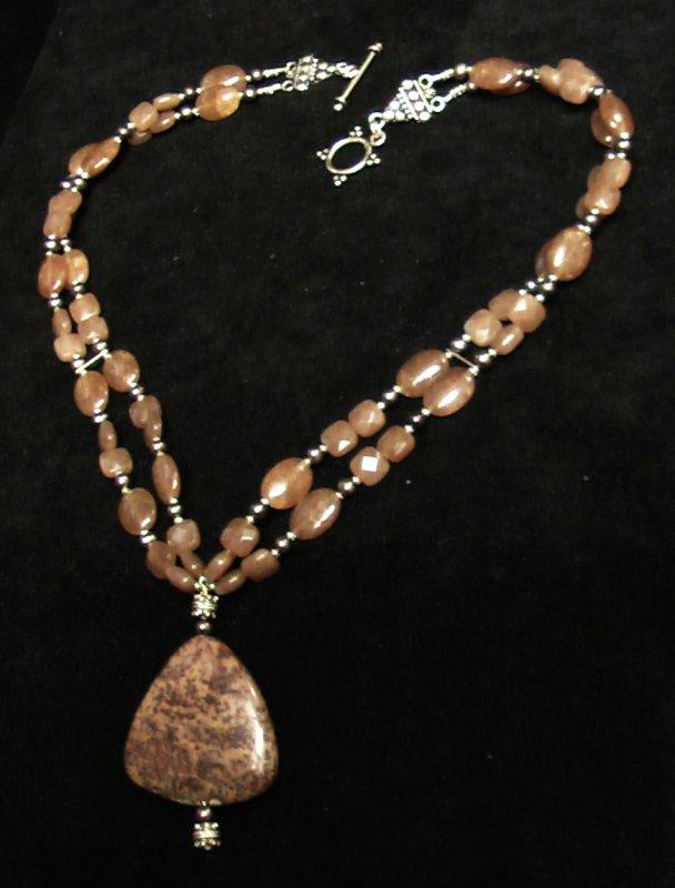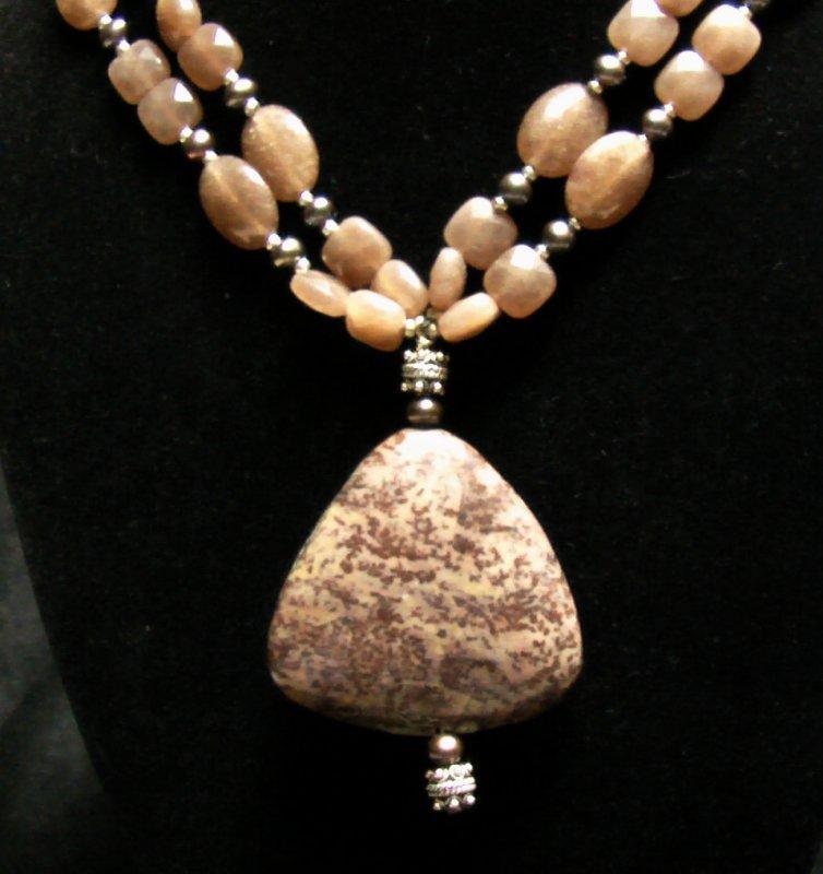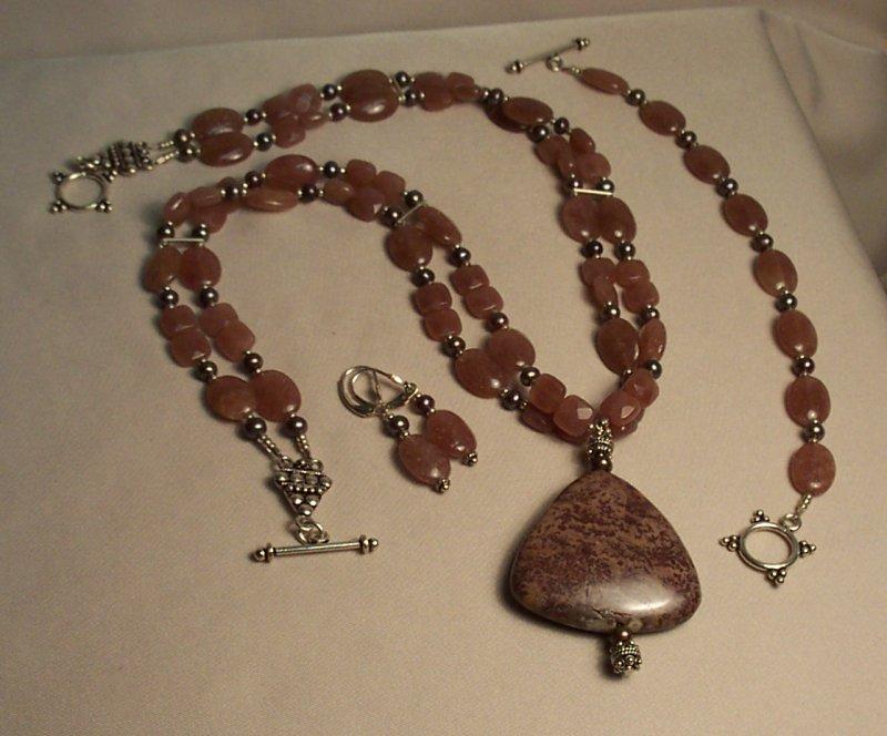 Jasper pendent 40/40mm, quartz oval 15/9mm, square faceted 8/8mm, pearl 5mm. Leverback earrings. Sterling.