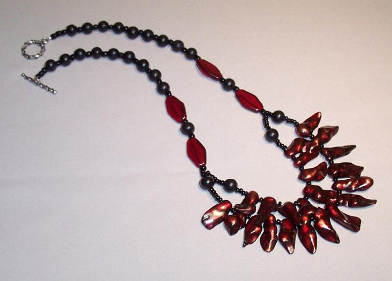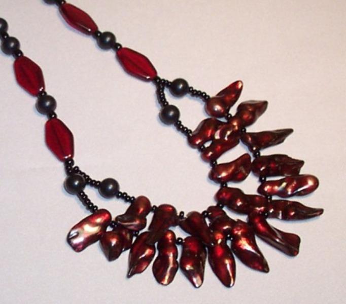 Cranberry red freshwater blister pearls 20/10mm, diamond glass 20/10mm, black horn round 8mm. Leverback earrings. Sterling.