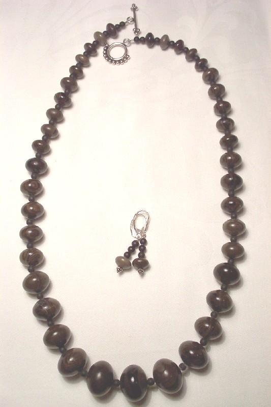 Graduated jasper from 22mm/10mm oval rounds. Black 4mm rounds. Leverback earrings. Sterling